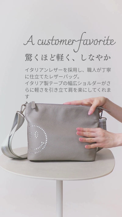 イタリアから取り寄せたおしゃれなパイレンテープを採用。約4cmの幅広デザインで、肩への負担を軽減し快適な使い心地が好評です。さらに、バッグ本体から取り外し可能な仕様なので、お手持ちの他のバッグにも気軽に取り付けてお使いいただけます。