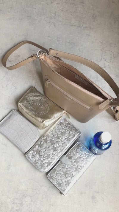 軽さにもこだわり、本体+ハンドルでわずか約306g、本体+ロングショルダーで約340g。肩に掛けても軽やかで、日常の装いに寄り添う贅沢な使い心地です。